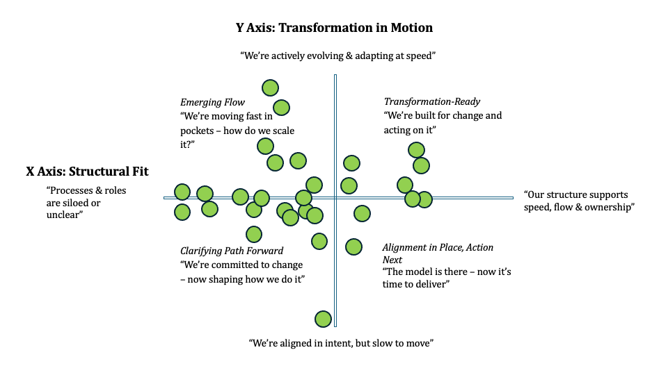 The outcome was striking: instead of clustering in one direction, participants spread out across all four quadrants. Some teams are experimenting and learning quickly in pockets (“emerging flow”), while others are still wrestling with structures and clarity (“clarifying path forward”). Only a minority felt truly “transformation-ready.”