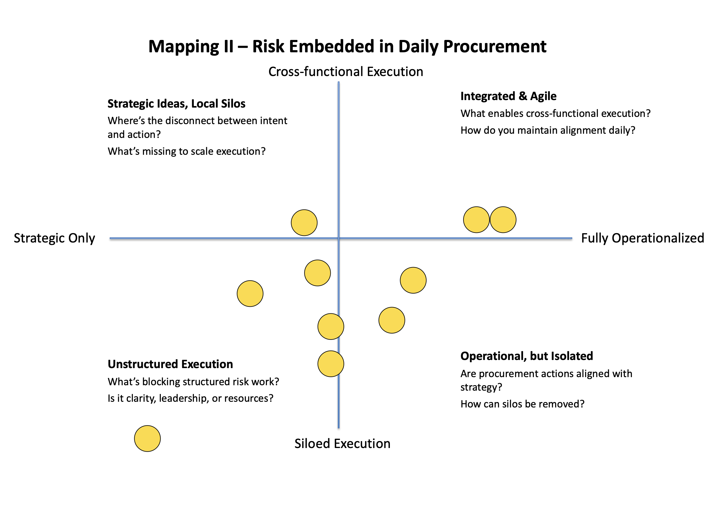 - Risk is often acknowledged at a strategic level, but embedding it into daily procurement actions remains fragmented.